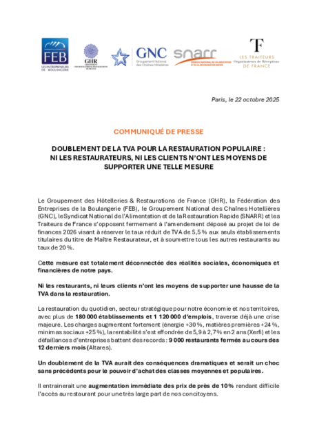 Dans un communiqué commun, le SNARR, la FEB, les Traiteurs de France, le GHR et le GNC se disent fermement opposés à l'amendement prévoyant de soumettre l'ensemble des restaurants à un taux de TVA de 20 %, contre un taux réduit à 5,5 % pour les établissements titulaires du titre de Maître Restaurateur. "Cette mesure est totalement déconnectée des réalités sociales, économiques et financières de notre pays. Ni les restaurants ni leurs clients n'ont les moyens de supporter une hausse de la TVA dans la restauration", déclarent-t-ils d'une même voix. Au-delà des chiffres mentionnés ci-dessus, le communiqué rappelle que les défaillances ont, selon Altares, atteint des niveaux records : en 12 mois, 9 000 restaurants ont fermé leur portes.