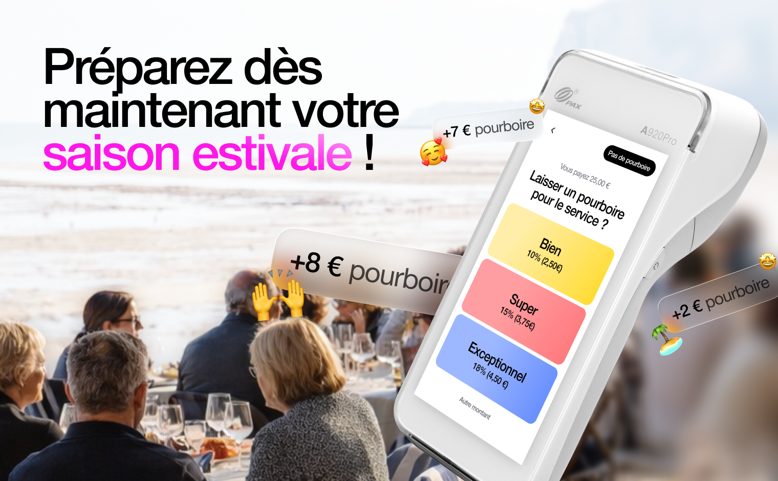Les restaurants de bord de mer font face à des défis spécifiques : flux de clientèle internationale, forte saisonnalité, gestion des pourboires et pression sur la qualité de service. sunday a développé un TPE intelligent qui répond précisément à ces enjeux, déjà adopté par des milliers d’établissements.