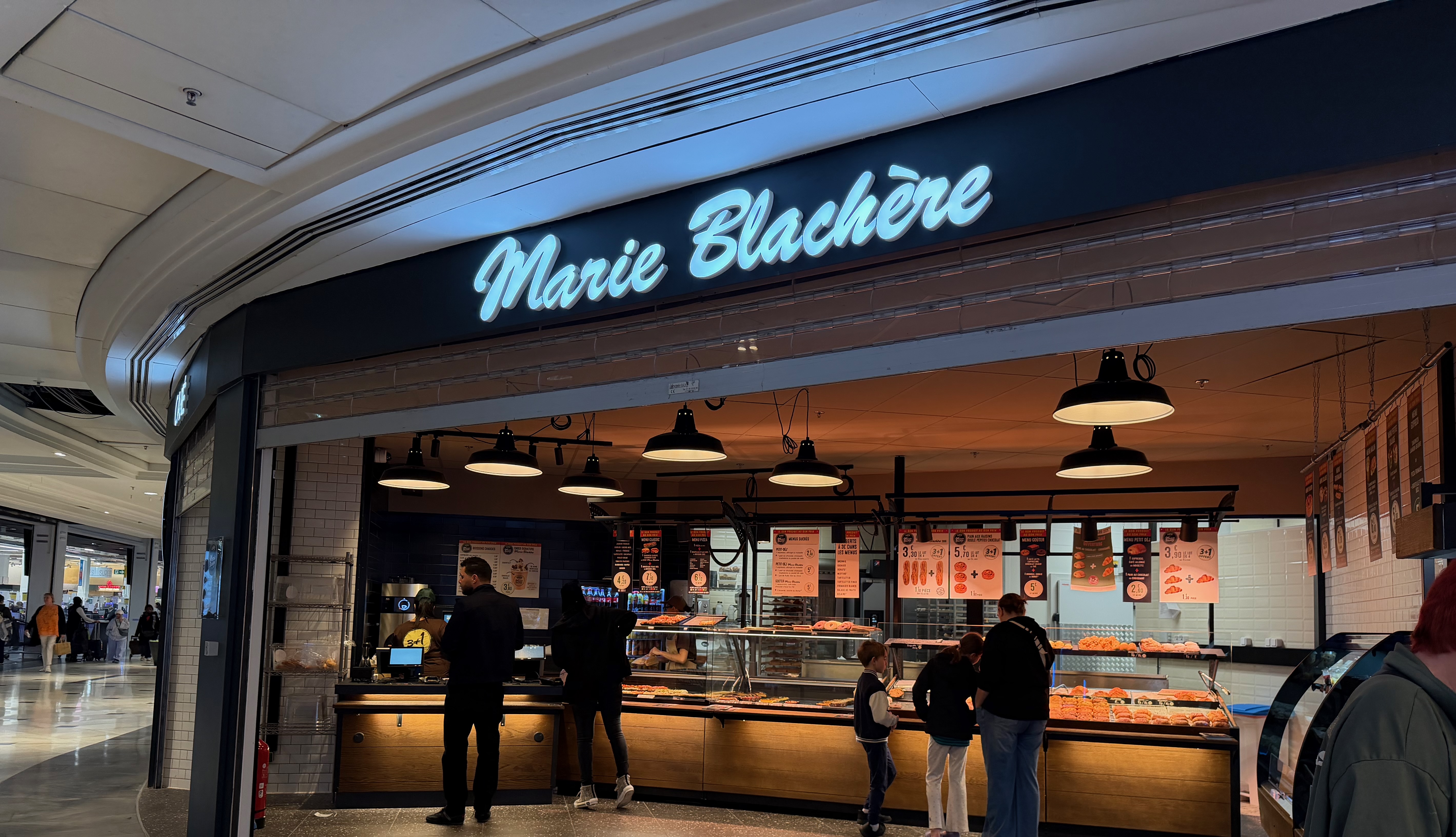 L'enseigne se positionne la promesse de prix attractifs, comme elle le fait dans plus de 850 boulangeries à travers la France. Le mécanisme de promotion permanente, avec un produit offert pour trois achetés, est repris sur plusieurs références, notamment côté viennoiserie et gâteaux de voyage (cookies, madeleines...). Dans cette banlieue cossue, Marie Blachère fait face à la concurrence de Maison Pradier (groupe Delineo), de Starbucks et même de l'offre snacking-boulangerie développée par l'hypermarché E. Leclerc dont l'entrée fait face au point de vente.
