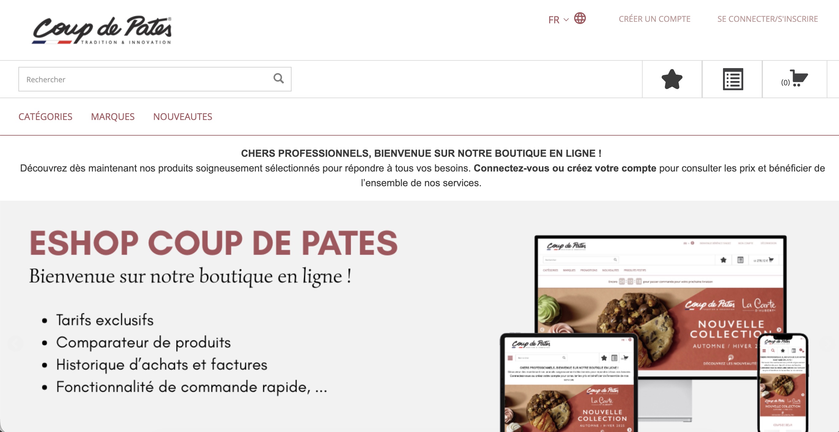 2 400 références sont désormais à portée de souris pour l'ensemble des boulangers, pâtissiers et restaurateurs. C'est le message que souhaite transmettre Coup de Pates en facilitant l'accès à son site de vente en ligne, pensé comme un outil au service des professionnels. Grâce à son accessibilité 24h/24 et 7j/7, il devient possible de passer commande à toute heure et en tout lieu, ce qui facilite grandement l'organisation et évite tout risque de rupture. Plusieurs fonctionnalités ont été intégrées afin de renforcer la praticité du site internet : historique de commande, factures, comparateur de produits, commande rapide grâce au cadencier et aux listes de favoris personnalisables...