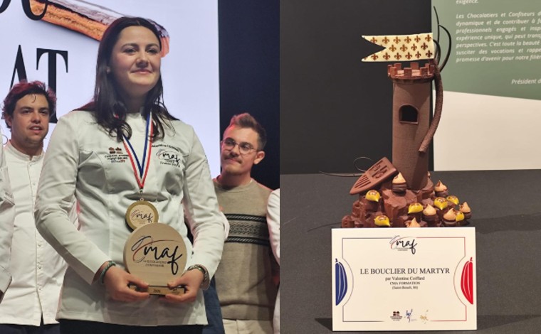 Relancé en 2022 par les Chocolatiers et Confiseurs de France (en partenariat avec la Société Nationale des Meilleurs Ouvriers de France), le concours du Meilleur Apprenti de France Chocolaterie-Confiserie bénéficie d'une visibilité forte sur un des événements majeurs de la filière sucrée : la remise des prix a lieu chaque année (cette année le mercredi 29 octobre) au sein du Salon du Chocolat et de la Pâtisserie de Paris, et les réalisations des participants y sont exposées. La pièce réalisée par Valentine Coiffard y est présentée : pensée comme un hommage à Jeanne d'Arc, sa réalisation chocolatée baptisée "Le bouclier du martyr" évoque la force intérieure et la persévérance. Une persévérance qui marque le parcours de la jeune chocolatière âgée de 22 ans, qui a choisi de se réorienter après un cursus universitaire en langues. Passionnée de création sucrée, elle a décroché le CAP Pâtissier puis Chocolatier et est désormais engagée dans un BTM Chocolatier Confiseur. Désormais ouverte à un riche parcours dans la filière, elle incarne pleinement le dynamisme des nouvelles générations d'apprentis... autant que la féminisation des métiers du goût, démontée une fois encore par ce concours, où huit des neuf finalistes étaient des femmes.