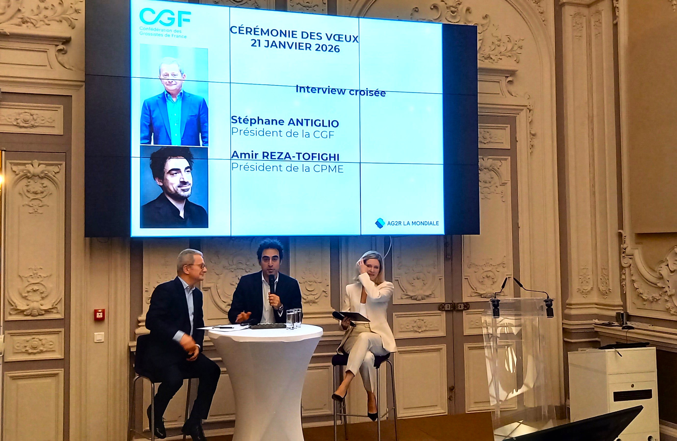 C’est lors d’une allocution ponctuée, non sans humour, de citations historiques faisant référence à la « situation politico-réglementaire difficile », que Stéphane Antiglio a présenté les vœux de la Confédération des grossistes de France (CGF), qu’il préside, ce mercredi 21 janvier, dans les locaux de la Chambre de commerce et d’industrie de Paris. L’occasion de partager la feuille de route de la Confédération, les enjeux à venir et les priorités de l'année qui commence, marquée évidemment par les élections municipales. Il a ensuite été rejoint par Amir Reza-Tofighi, président de la CPME, pour un temps d'échange autour de l'engagement des entrepreneurs, du rôle des organisations patronales et des grandes échéances politiques à venir.