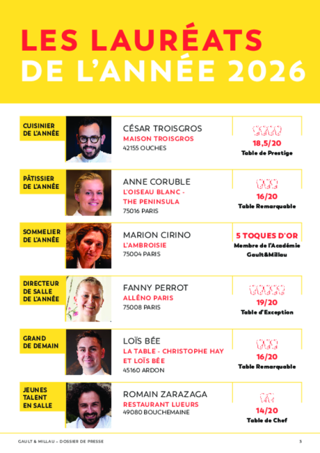 Parmi les autres lauréats de ce palmarès 2026 : Anne Coruble (L'Oiseau Blanc - The Peninsula, Paris 16e) Pâtissière de l’année ; Marion Cirino (L’Ambroisie, Paris 4e) Sommelière de l’année ; Loïs Bée (La Table - Christophe Hay et Loïs Bée, Ardon, 45) Grand de demain ; Fanny Perrot (Alléno Paris 8e) Directrice de salle de l’année ; Romain Zarazaga (Restaurant Lueurs, Bouchemaine, 49) Jeune talent de l’année.