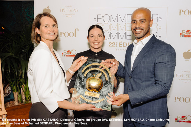 « Cette distinction est le fruit d’un engagement collectif, celui de femmes et d’hommes qui, chaque jour, font de la sécurité alimentaire une priorité au service de leurs clients », a souligné Priscilla Castaing, directrice générale du Groupe BVC Expertise, qui a remis le trophée à Lori Moreau, cheffe exécutive, et Mohamed Bendari, directeur du Five Seas. Lori Moreau devient la première femme cheffe exécutive à recevoir cette distinction depuis la création du Trophée Pomme d’Or en 2002.