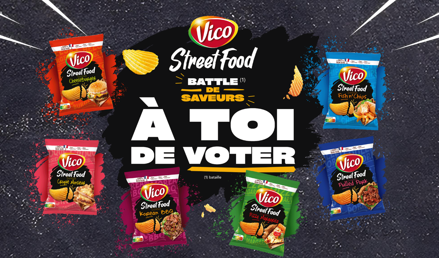 Vico propose aux consommateurs de voter pour leur parfum de chips préféré qui sera produit en 2026. 6 arômes emblématiques de la street-food sont mis en jeu.