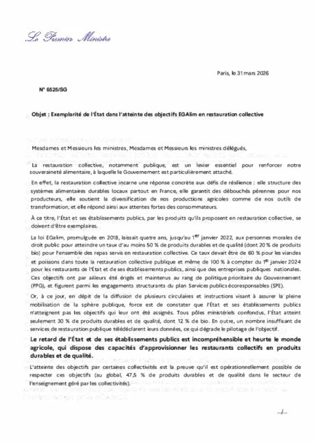 Dans une lettre datée du 31 mars 2026, le Premier ministre Sébastien Lecornu somme l'ensemble des membres du gouvernement de mettre leurs cantines en conformité avec la loi EGAlim, sans délai.