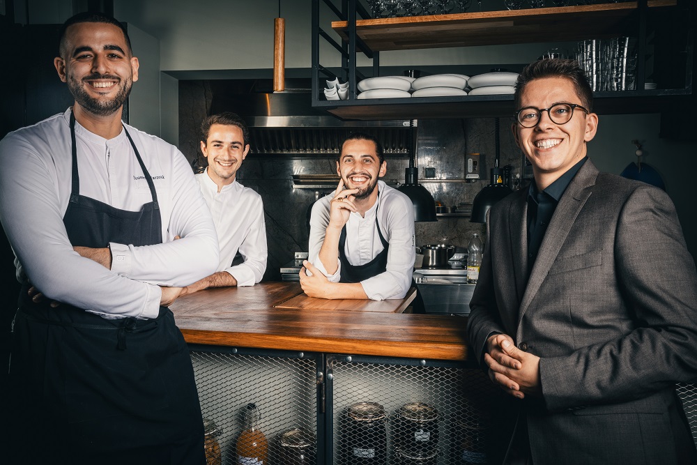 A ses côtés, trois associés : Louis Beaurepaire, Julian Patary et Thibault Blanche. « Nous sommes trois chefs et un directeur de salle. Il n’y a pas de vrais postes dans le sens où nous faisons tout à 4. Avec 15 couverts le lieu est assez intime, nous voulions casser les barrières avec une cuisine ouverte. Les chefs peuvent servir en salle et le directeur de salle aider au dressage », explique Youssef Marzouk. Même esprit d’équipe pour la création de la carte ou le choix des vins. « Être entrepreneur c’est être touche-à-tout et pas seulement cuisinier ! Nous prônons la polyvalence. »
