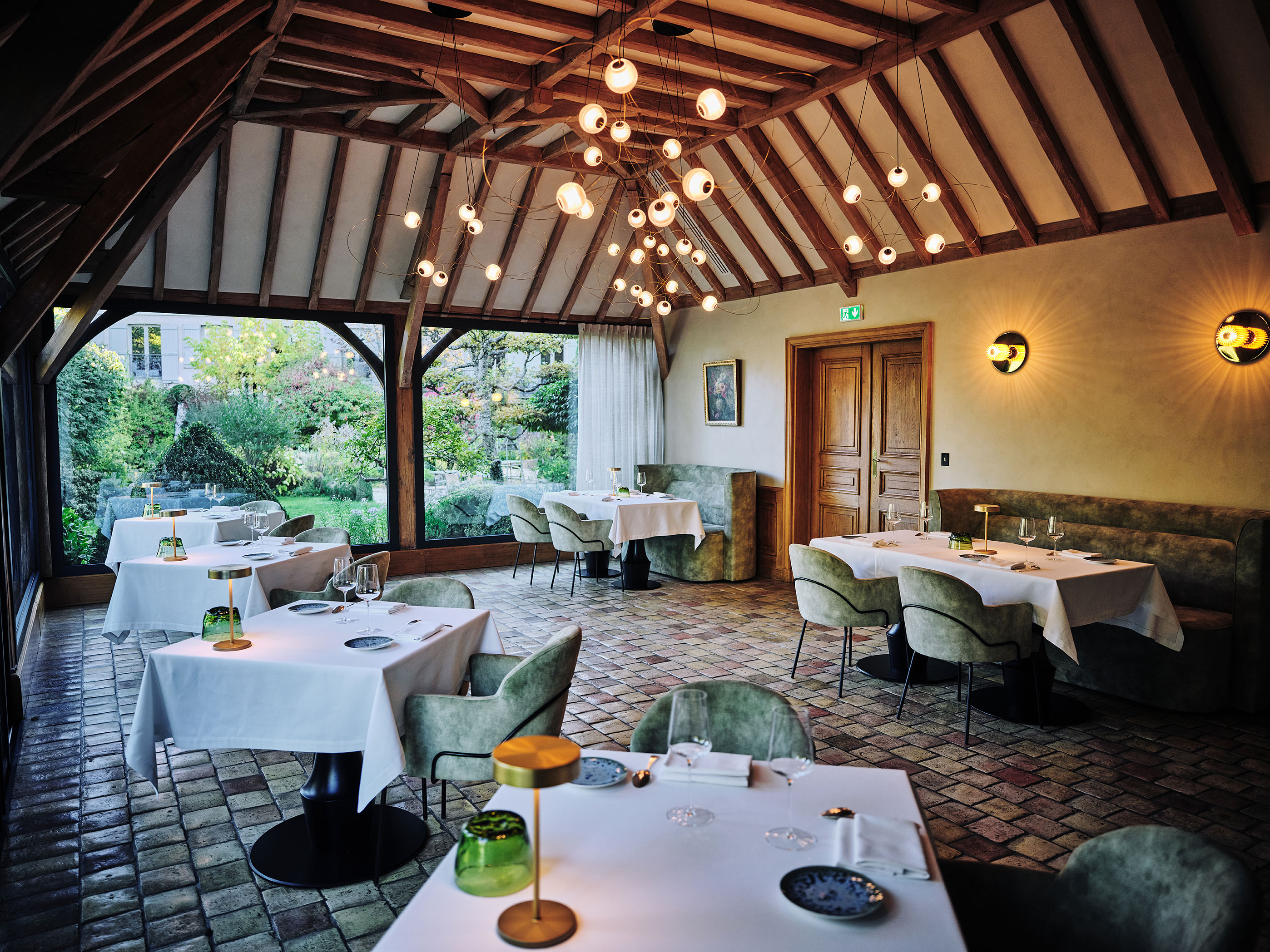 C’est ainsi que sont nées trois ambiances dans les trois salles : Le Jardin d’hiver, une grande rotonde vitrée donnant sur le jardin ; Le Boudoir, un espace intime enveloppant et romantique ; et Le Balcon offrant une sensation d’immersion dans la nature. Le tout complété par la Cave de dégustation conçue comme une ode au terroir de Bourgogne ; la Table d’hôte, un espace dédié aux tablées conviviales, devant la grande cheminée et la bibliothèque de Bernard Loiseau ; et enfin la Table du chef située devant le pass du chef et qui plonge le convive au cœur de la brigade.