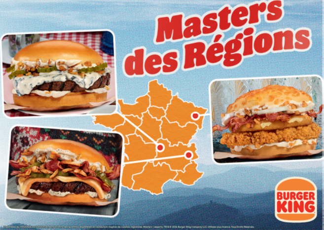 Du 17 février au 30 mars, Burger King France déploie la deuxième édition de l’opération Masters des Régions. Cette initiative vise à proposer des recettes inspirées de spécialités régionales françaises tout en valorisant les filières agricoles et agroalimentaires nationales. Trois nouveaux burgers sont commercialisés sur la période : le Master Alsacien, le Master Auvergnat et le Master Savoyard. Ils sont élaborés à partir de bœuf 100 % d’origine française, grillé à la flamme, et de fromages issus de filières françaises, dont plusieurs AOP.