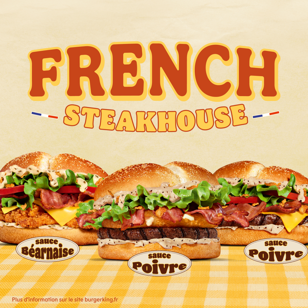 À partir du 31 mars, Burger King relance sa gamme Steakhouse avec trois recettes. Le French Steakhouse Poivre revient dans sa version originale : viande grillée à la flamme, cheddar fondant, bacon, tomates, oignons crispy, salade iceberg et sauce poivre.