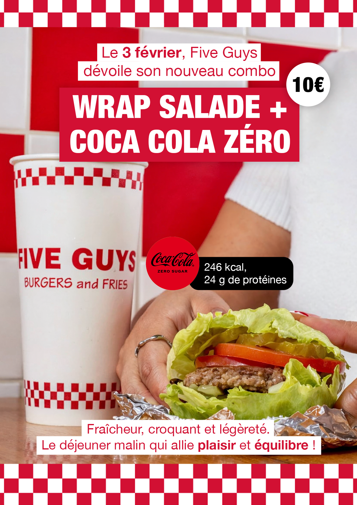 Connu pour ses frites, burgers et hot-dogs, Five Guys sort un menu qui va à contre-courant, affichant seulement 246 kcal, dont 24 g de protéines. Comprenant un wrap et un Coca-Cola Zero, cette version healthy se compose d’une feuille de laitue en guise de pain à burger, ainsi que de tomates, champignons, oignons grillés, poivrons et cornichons.